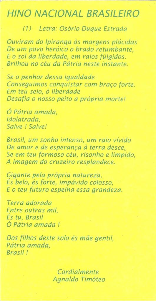 Mensagens HINO NACIONAL BRASILEIRO: O MAIS BELO Publicado por Julio Cesar Leal em 2 de abril de 2020 JA D Partilhar isto: Compartilhar no X(abre em nova janela) 18+ Compartilhar no Facebook(abre em nova janela) Facebook Relacionado Publicado por Julio Cesar Leal Mineiro de Itajubá! Nascido em 13 de Abril de 1951. Treinador de Futebol. Campeão Mundial U.20 como Treinador em 1993, na Austrália! Ver todos os posts de Julio Cesar Leal