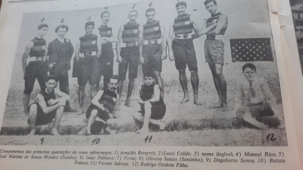 FLAMENGO’S NAME APPEARED ON BANNERS AT THE REGATTAS, WHERE THE CREW OF THE BOAT BELOW SHOWS DIFFERENT SHIRTS.