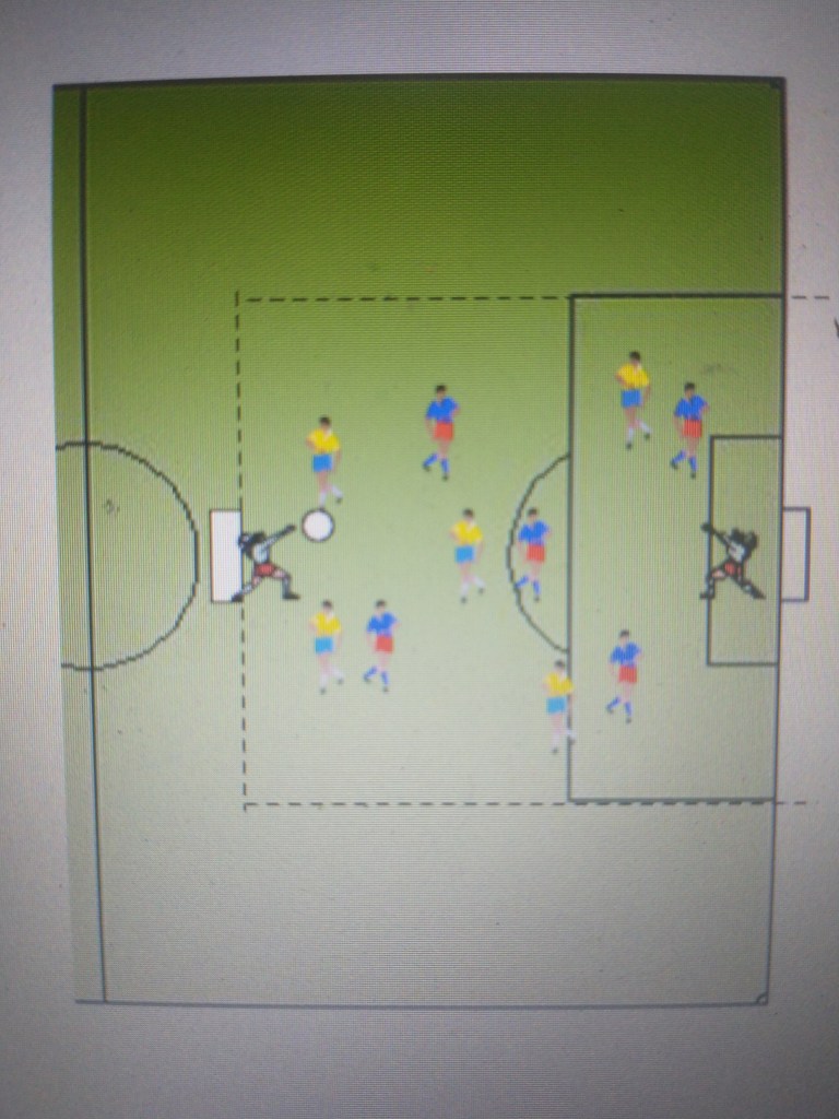2nd game: zone marking; generally, each team of 5 is composed of 1 central defender, 1 full-back, 1 midfielder, 1 attacking midfielder and 1 striker, in addition to the goalkeeper.