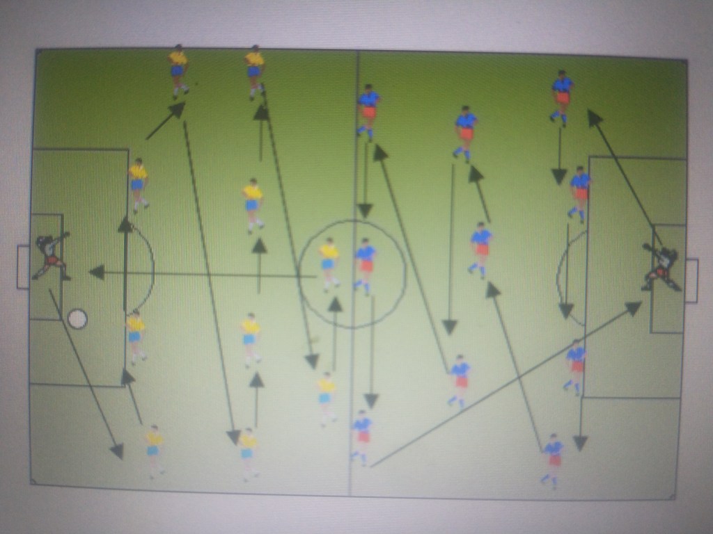 Tips: (in the photo the blue team uses the G-4-3-3 and the yellow the G-4-4-2, for about 5 minutes, from there a brief stop for the 1st. Rotation as described above, with 5 minutes in this formation. Every 5 minutes a new rotation until all players have gone through all the positions or functions, returning each one to the original position, when one must play more than 5 to 15 minutes to consolidate the original position with new knowledge and experience.