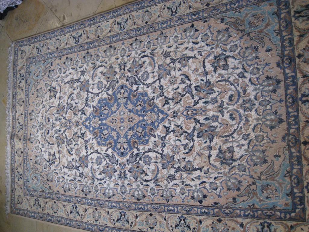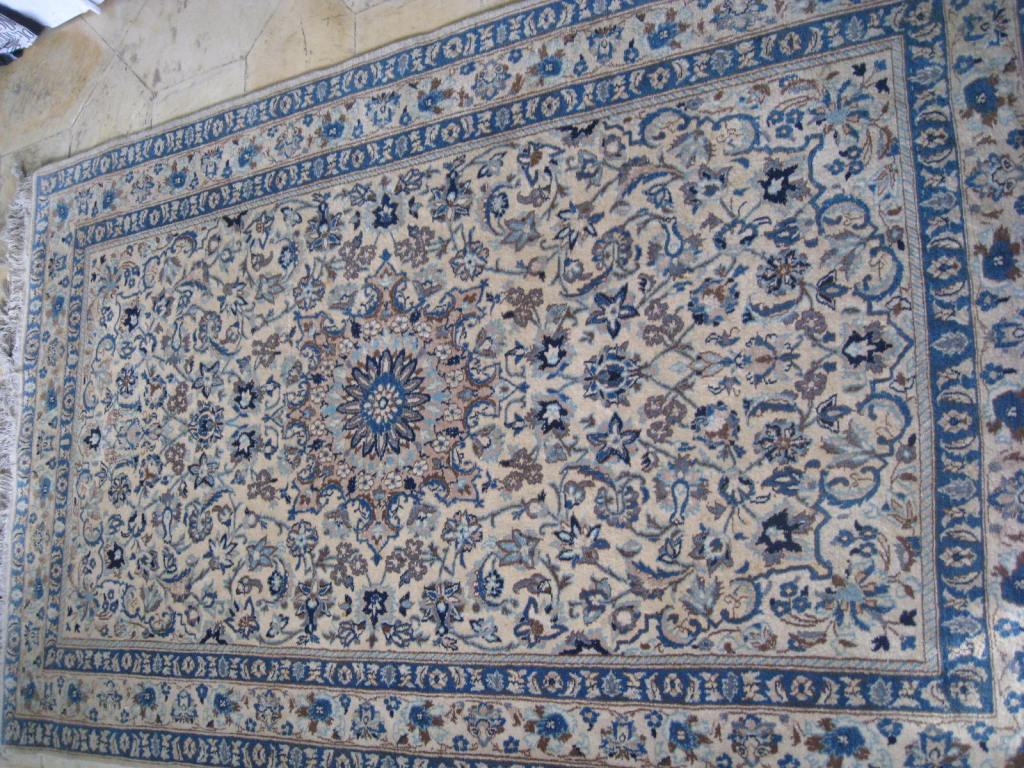 – Tapete azul e bege com flores, mais claro, mede 2,07 x 1,215, Naim Persa.