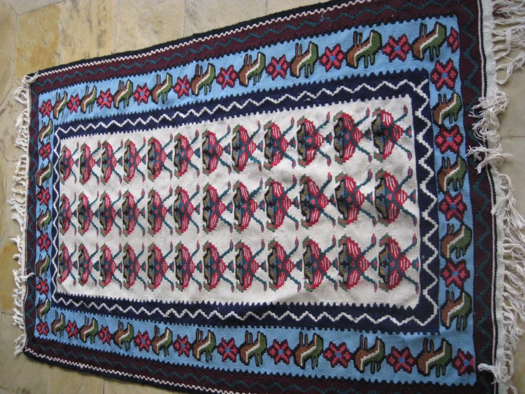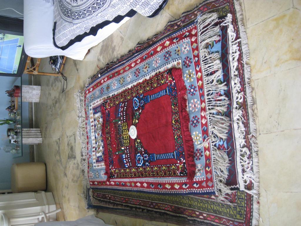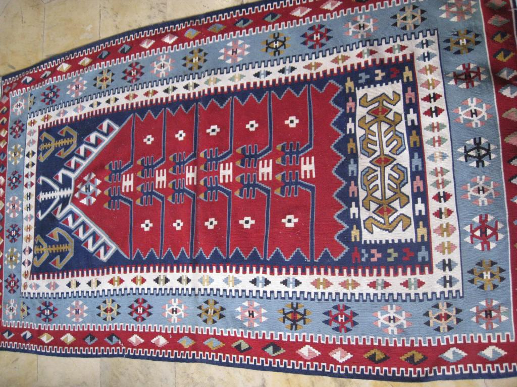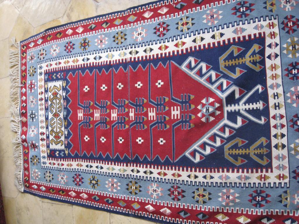 – Tapete com borda bordô, azul e bege, mede 1,57 x 1,015, também Kilim.
