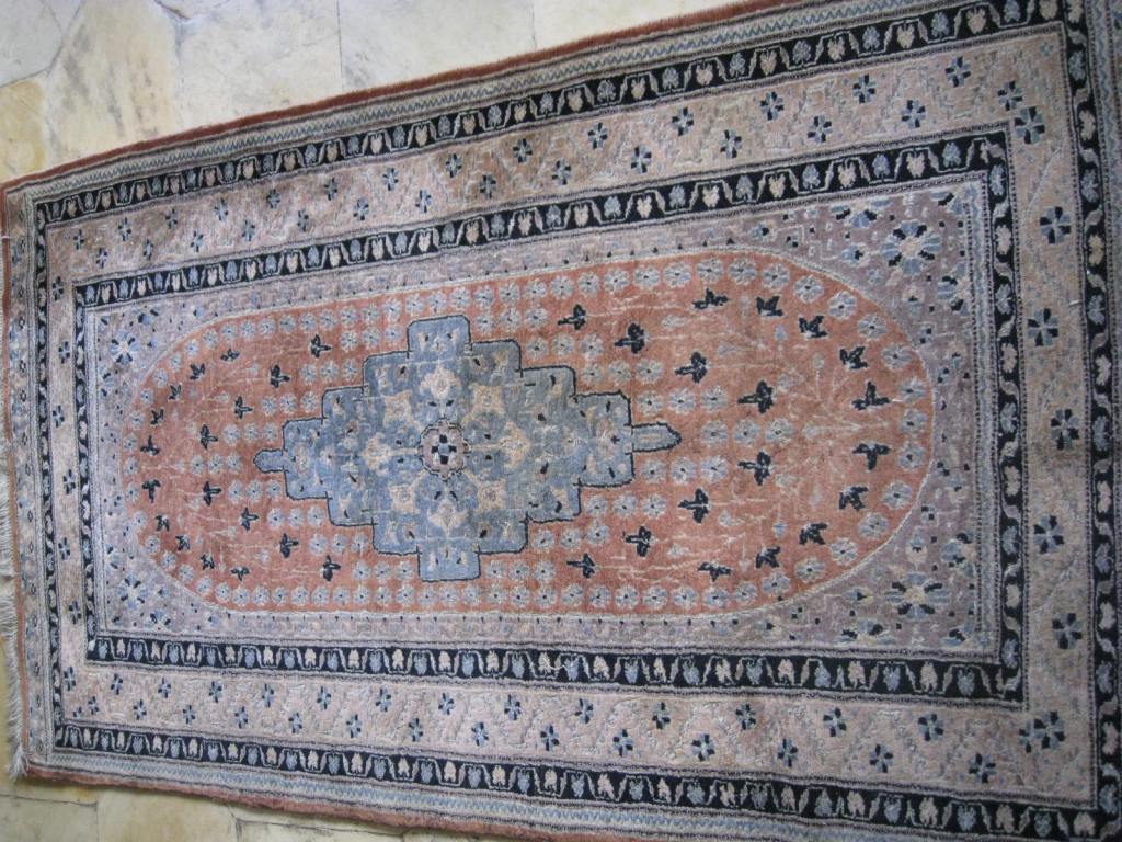 – Tapete marinho, telha, azul claro e rosê, com 1,035 x 0,945, feito no Paquistão.