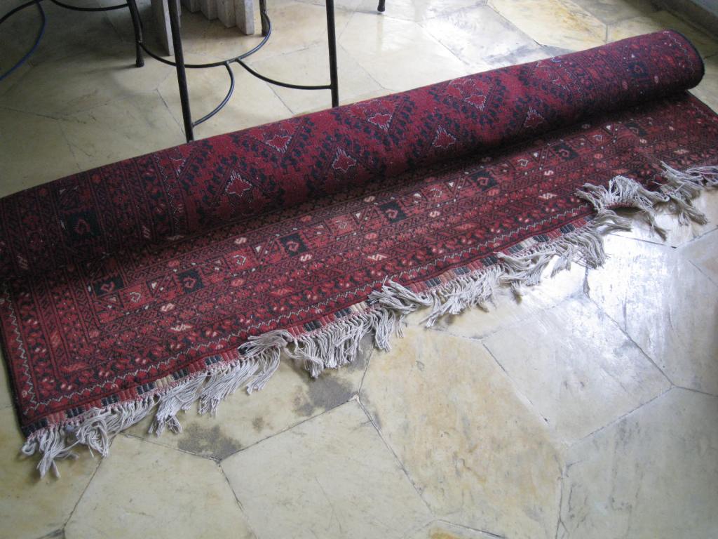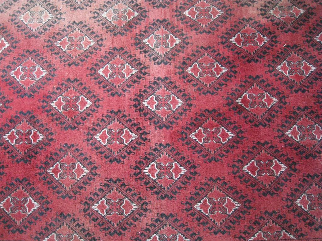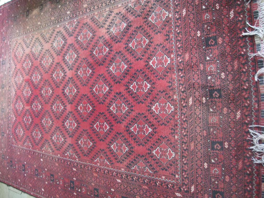 – Tapete grande vermelho, com 2,975 x 1,935, confeccionado no Afeganistão.
