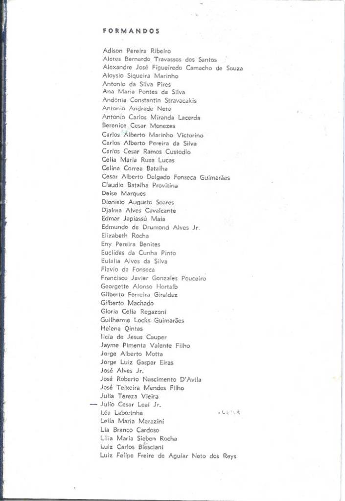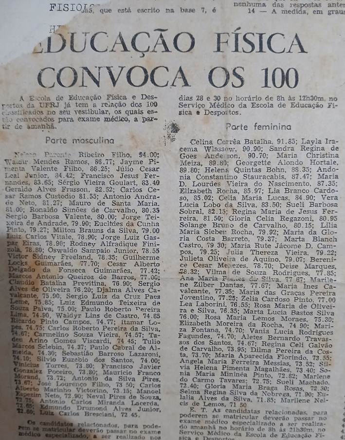 Expectativa até o dia da divulgação das notas, dos aprovados (50 mulheres e 50 homens no primeiro semestre, 50 homens e 50 mulheres no segundo). Baduzinho foi ao Prédio na Urca onde afixaram as listas. Começou pelo 100º. da lista dos homens, pontinha do dedo subindo na página, nada… de Julio, foi para a lista dos 50 primeiros (os do primeiro semestre) 50 (cu na mão), 40 (néris de pitibiriba), 30 (caracoles), 20 (que merda), 10 (phodeo), 9, 8, 7, 6, 5, 4 (parou, parecia ele, havia um Tulio Sclebin, voltou ao 4, era ele mesmo, Julio Cesar Leal Junior, alívio, alegria incomum, só queria passar. Feliz! Seguiu, o pódio: 3º. Jayme Pimenta Valente Filho (Cara Bom – Jogador de Futebol. Orador na Formatura), parabéns! 2º. Waldyr Mendes Ramos (Cara Bom – Natação e Water Polo. Mais tarde Diretor da Faculdade, a EEFD), Parabéns! 1º. Nelson Parente Filho (Cara Bom – Remo. D.E.P.). Viu as listas das Moças, pois gostava de todas as meninas da turma do pré, era o mais jovem, e vibrou quando reparou nos nomes aprovados, principalmente a Insulana Solange Bruno de Carvalho que deu muitas caronas quando Julinho ainda não possuía carro. Pódio Feminino: 3a. Sandra Regina de Goes Anderson; 2a. Layla Iracema Wlassow (Alpinista), Celina Corrêa Batalha – 91.83 (Oradora na Formatura). Turma Pioneiros do Fundão, que ao completar 50 anos de formada, em 2022 passou a denominar-se Pioneiros de Ouro do Fundão, e até os dias de hoje, 2026, reúne-se anualmente no primeiro sábado de dezembro.